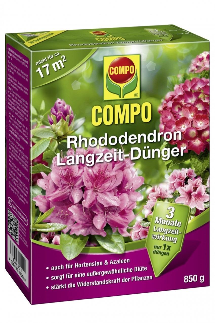 Uudne väetamissüsteem, kus toitainete vabastamine toimub kahes faasis. Helehallid väetisegraanulid vabastavad toiteained kohe nii, et taimed on esimesest päevast alates kõikide olulisemate põhi- ja mikrotoitainetega varustatud. Kõrge algvajadus kaetakse seeläbi optimaalselt. Vaigukihiga kaetud rohelised väetisegraanulid katavad hilisema toitainete vajaduse. Nende pikaajaline toime 3 kuud hakkab aeglaselt mõjuma. Soojuse ja vee mõjul tungivad toitained vähehaaval läbi ümbriskihi. Tänu väetisele õitsevad taimed rikkalikult. Ühekordsest väetamisest piisab terveks õitsemishooajaks. Optimaalne varustamine tänu esmasele ja pikaajalisele mõjule. Pole üle- ega alaväetamist, vajadusekohane doseerimine vastavalt niiskusele ja soojusele. Kõik olulisemad põhi- ja mikrotoitained igas teras hoolitsevad tugeva õie ja terve kasvu eest. Tänu väetisele suureneb vastupidavus haiguste ja kahjustuste vastu. COMPO pikaajalise toimega rododendroniväetis on kooskõlas sootaimede/helofüütide, näiteks rododendronid, asalead, erikad, hortensiate ja fuksiate spetsiaalsete vajadustega. Väetis sobib ka mustikatele.